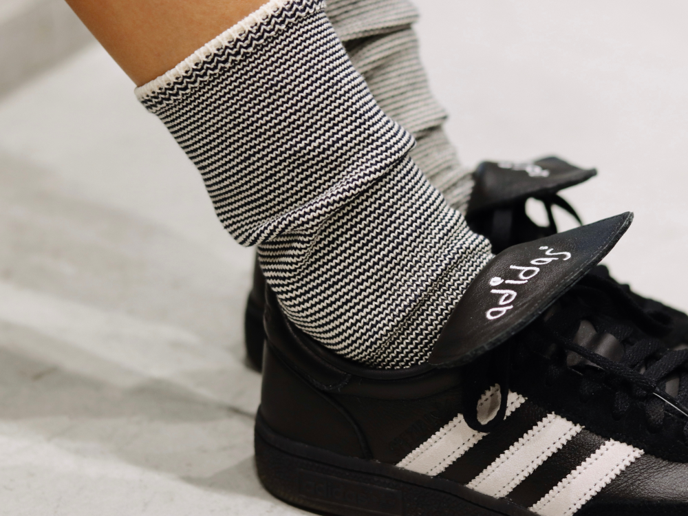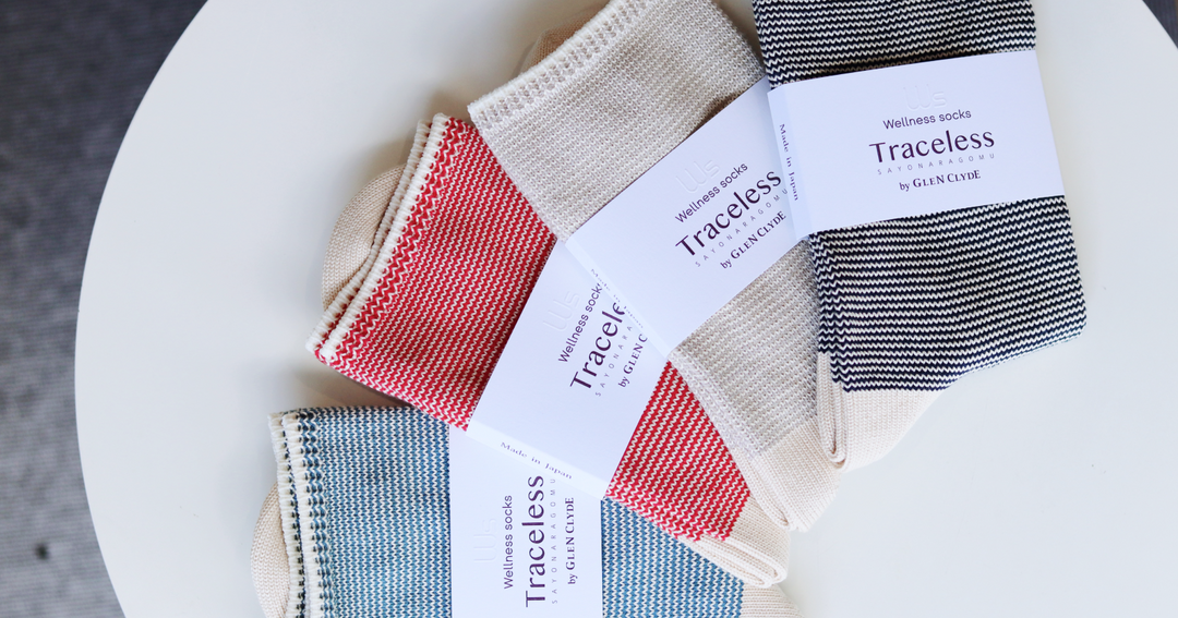 「Traceless / ゴムとさよならするソックス」はゴムを使用してないので締め付けがありません。さらに、職人が一目一目を手で縫い合わせていく「ハンドリンキング」を採用して、つま先の縫い目が当たってしまうストレスを軽減しています。糸を紡績したときに落ちたコットンをもう1度バージンコットンと合わせたリサイクルコットンを使用して、かかととつま先に補強を入れることで、環境に配慮しつつ、長く愛用していただけるようなつくりにしました。